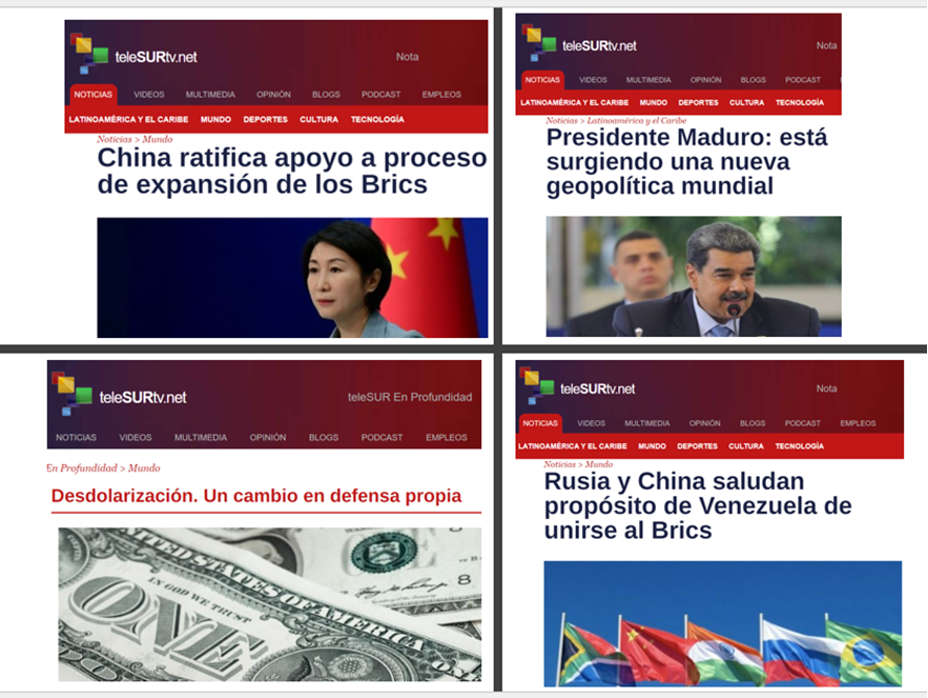 Screencaps of Venezuelan TeleSUR headlines regarding the BRICS published between May and August 2023. (Source: TeleSUR/archive, top left; TeleSUR/archive, top right; TeleSUR/archive, bottom left; TeleSUR/archive, bottom right)