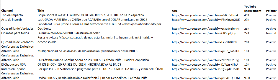 Content related to the rise of the BRICS also appeared in YouTube channels in the months ahead of the summit, with the most popular videos favoring de-dollarization and the creation of the bloc’s digital currency for global exchange. Pro-Kremlin YouTube channels seemingly based in Mexico posted the most popular content in Spanish discussing BRICS.