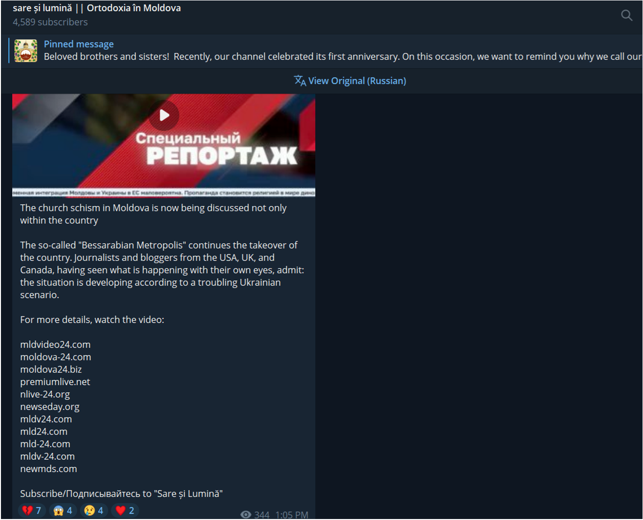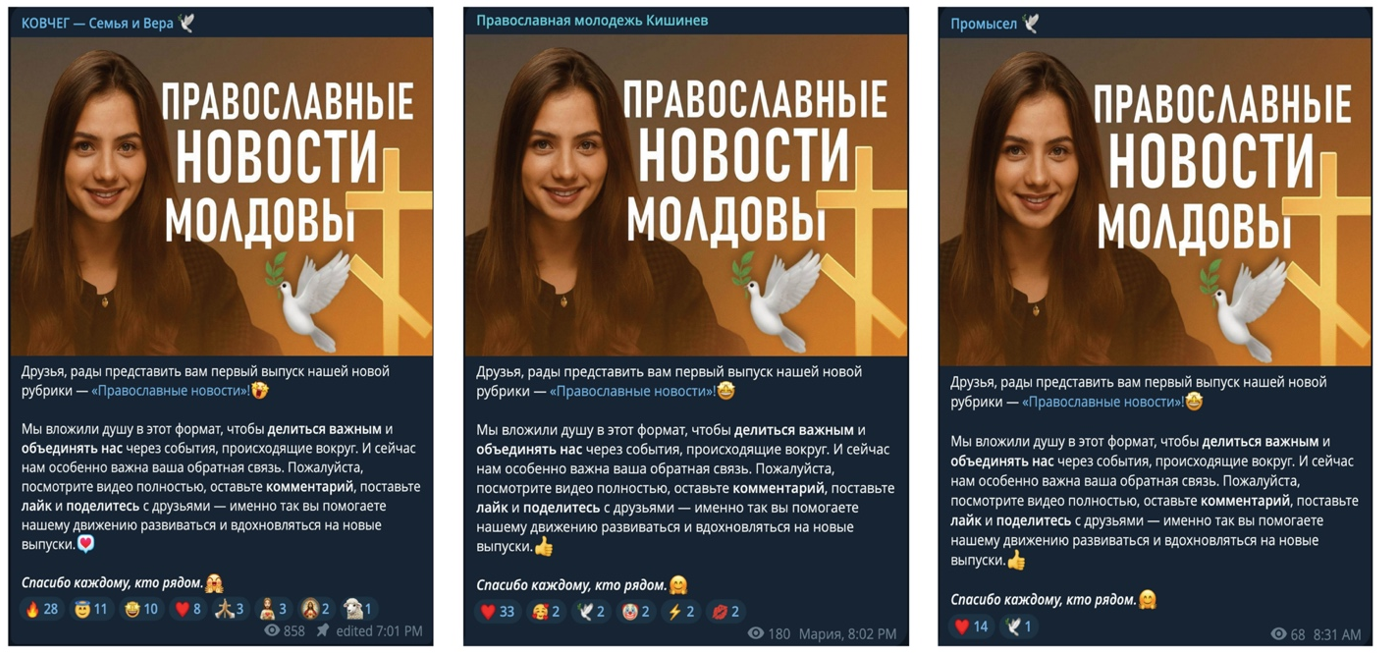 On July 4, KovchegMD posted on Telegram about the launch of the first episode of their new YouTube series, “Orthodox News.” The format aims to share social, religious, and political updates to build a community around current events. Hosted by a young woman named Anastasia, the series streams on the YouTube channel of KovchegMD. Interestingly, the same post was published in two other Telegram channels, Youth Orthodox of Chisinau and “Промысел” (Divine Providence), announcing the launch of “their new program.” Earlier, representatives of Youth Orthodox of Chishinau were seen distributing the printed newspaper of Salt and Light in Moldova, which underscores its connection to the broader Matushka network. The use of identical posts across three separate channels strongly suggests interconnection, while the frequent reposting of Orthodox News links throughout the wider network points to a deliberate cross-sharing strategy.