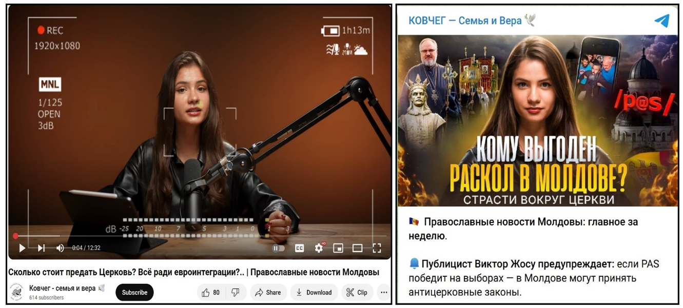 On YouTube, two Matushka channels, @sare.si.lumina and @kovchegMD, promoted political messages. In two videos, published on July 18 and July 25, the host cited Orthodox journalist Victor Josu, warning that “If the PAS party wins the parliamentary elections, anti-church laws may be introduced in Moldova.” The claim was amplified in the network’s Telegram channels. While claiming the Church should not endorse parties, the host urged the clergy to provide “moral guidelines” shaping political behavior and warned that a PAS victory would mean “usurpation of power” and the loss of real representation.