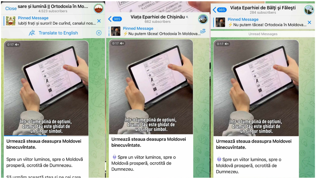 On September 26, the final day of the electoral campaign, the Salt and Light Telegram network posted a message urging Orthodox believers to “follow the star.” The post was accompanied by a video displaying a ballot paper with the vote cast for the “Patriotic” electoral bloc, comprised of the Party of Communists of the Republic of Moldova (PCRM) and the Party of Socialists of the Republic of Moldova (PSRM), which uses the star as its electoral symbol.