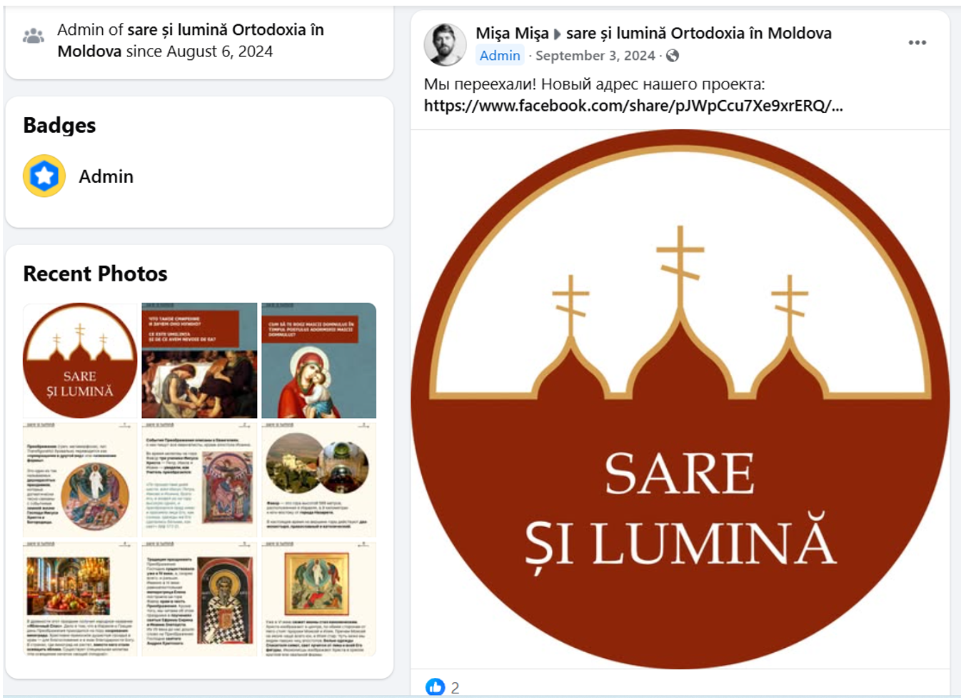 It appears that the Salt and Light Facebook assets are managed from Russia and linked to Forma.ru, one of Russia’s most prominent Orthodox media outlets. An earlier, now inactive group with the same name (Salt and Light Orthodoxy in Moldova) was created on August 6, 2024, shortly before Moldova’s presidential elections. The group was administered by Matvei Kipnis, Asya Rigel, and Mișa Mișa and used identical visual branding to Salt and Light, indicating the current online platform may be a continuation of earlier efforts to mobilize Moldovan Orthodox communities online. The “about” section of Matvei Kipnis’s profile says he is from Yaroslav, Russia, is currently based in Moscow, and works as a podcast director at Forma. A reverse image search for Mișa Mișa’s photo identified him as Mikhail Kuznetsov, the senior editor of Foma’s website and social media projects. Kuznetsov also appeared in the earlier group under his real name. On September 3, 2024, Mișa Mișa announced that the project had “moved” to a new “address,” using the same logo now used by Salt and Light.