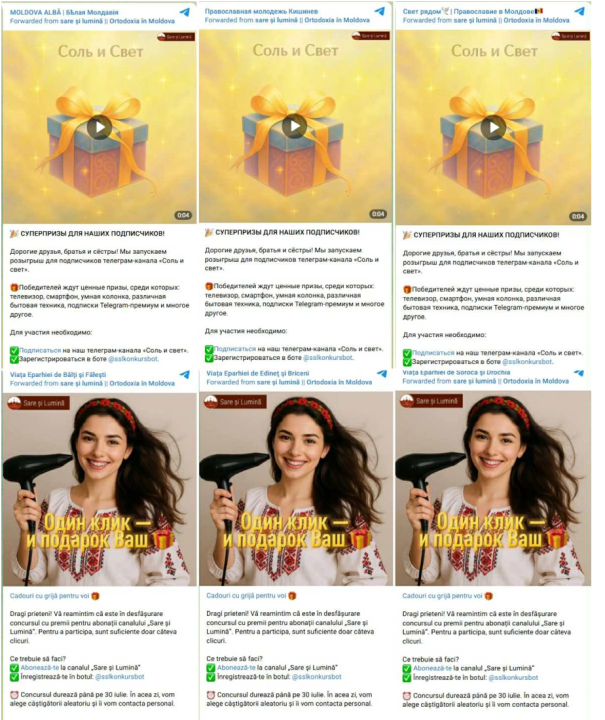 Another QR code in the Sare și Lumină newspaper directed users to a Telegram channel of the same name, which was created on June 27, 2024. As of September 12, it had 4,672 subscribers. The Telegram channel largely mirrored the Facebook page. The channel served as the hub of operation, as all contests in the paper and on social media directed people back to it. The channel frequently ran contests with small prizes for new subscribers, requiring entrants to submit personal data via a bot. The effort appears to be designed to collect data. Multiple religious channels promoted nearly identical contests, indicating a coordinated effort to expand Salt and Light’s audience.