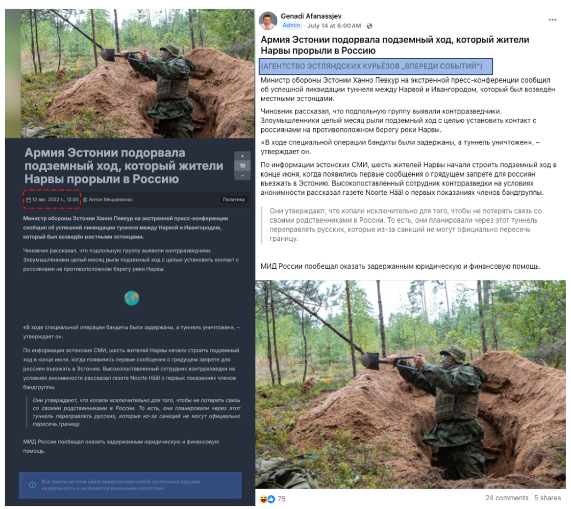 Screenshots of news stories titled “The army of Estonia blew up the underground tunnel that Narva residents dug into Russia.” The highlighted texts are disclaimers. The red-dotted box highlights the original publishing date. (Source: Panorama.pub/archive, left; genadi.afanassjev/archive, right)