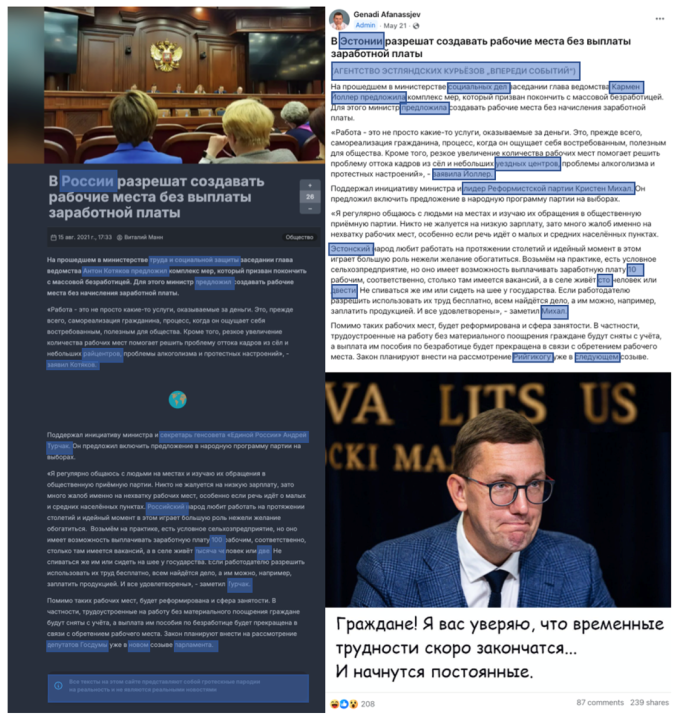 Screenshots show how the satirical story titled “Russia to Allow Creation of Jobs Without Paying Salaries” was edited and posted with the title, “Estonia to allow creation of jobs without paying salaries.” The highlighted parts of the text illustrate differences between the two texts. (Source: Panorama.pub/archive, left; genadi.afanassjev/archive, right)