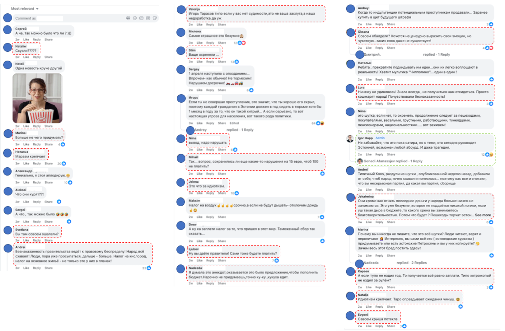 The narrative concerning unpaid jobs was the most engaged-with post by Afanasyev in the group  (208 reactions, 87 comments, 241 shares), followed by a post alleging that “Marinating meat at home has been banned in Estonia” (115 reactions, 75 comments, 174 shares), and a post suggesting that “Estonia will introduce 100 euro fee for ‘exemplary drivers’” (144 reactions, 50 comments, 101 shares).