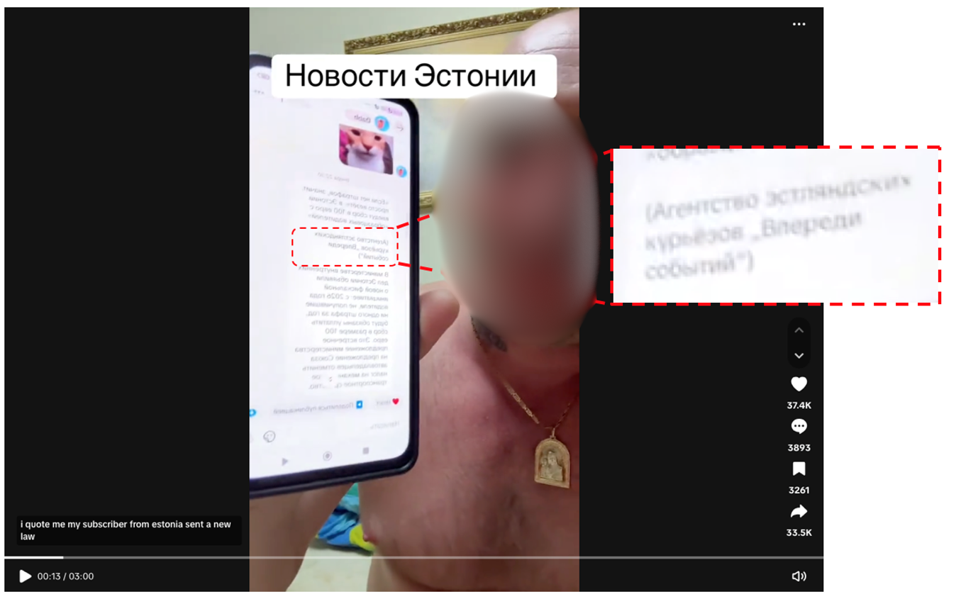 On TikTok, the narrative was repackaged in a video where a Russian user with the screen name “Denchik Krymsky” (“ДЕНЧИК КРЫМСКИЙ”) presented the story as “Estonian News,” accompanied by laughter. At the beginning of the video, the blogger said that he was quoting a “new law,” citing a message sent to him by a subscriber in Estonia, and showed his smartphone screen. Although the screen appeared in a mirrored view, one can still distinguish the “Agency of Eastland Curiosities” label.
