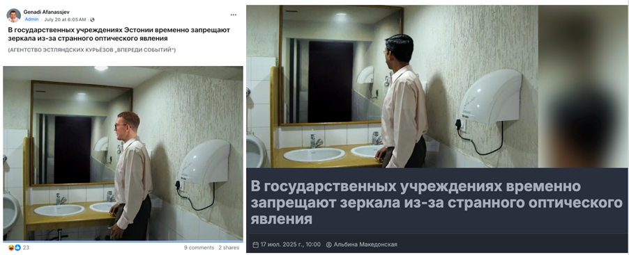 Screenshots show that a post titled “Estonian government agencies temporarily ban mirrors due to a strange optical phenomenon” was altered to include Estonian Prime Minister Kristen Michal. (Source: genadi.afanassjev/archive, left; Panorama.pub/archive, right)