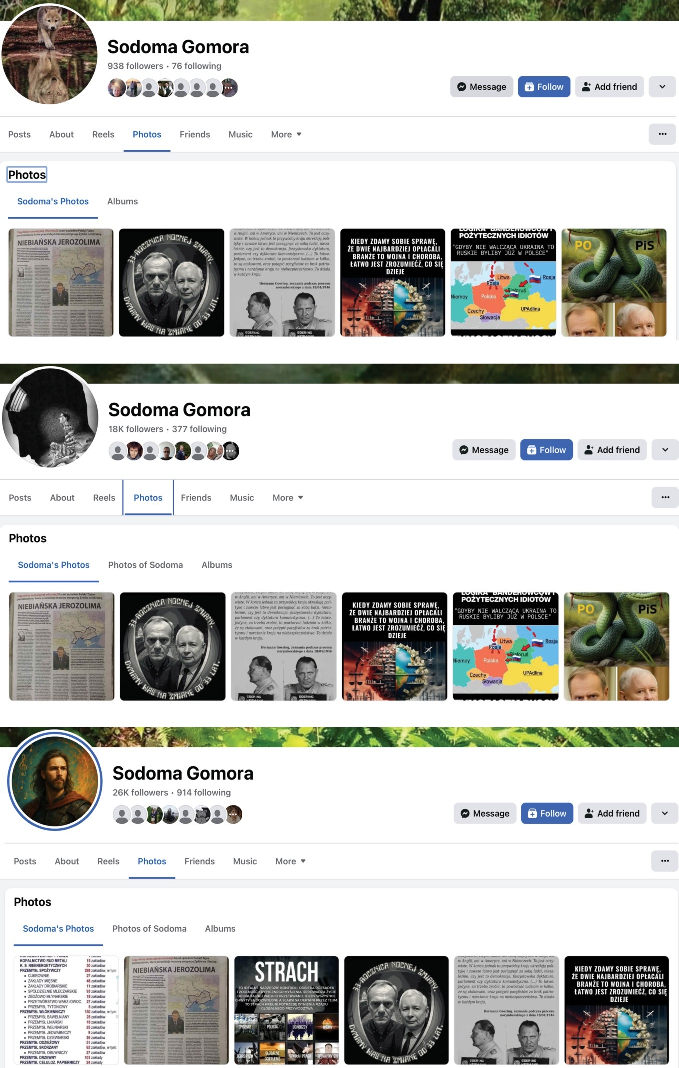 Screenshots of Facebook pages amplifying anti-Ukrainian war-dragging narratives. (Source: Polski Ruch Patriotyczny/archive, top; Polska i Ukraina/archive, center; Nie dla banderyzmu/archive, bottom)