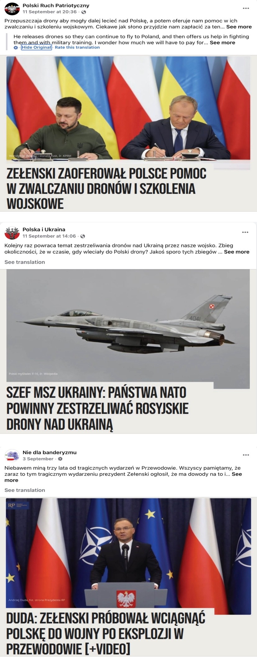 Another network of three interconnected nationalist Facebook pages also amplified the claim that the drone incursion was a Ukrainian provocation intended to drag Poland and NATO into war with Russia. These pages are “Polska i Ukraina” (“Poland and Ukraine”), “Polski Ruch Patriotyczny” (“Polish Patriotic Movement”), and “Nie dla banderyzmu” (“No to Banderism”). The pages frequently share each other’s anti-Ukrainian posts. Many of their posts feature screenshots of articles from Kresy.pl, a website that has for years published material portraying Ukrainians in a negative light.
