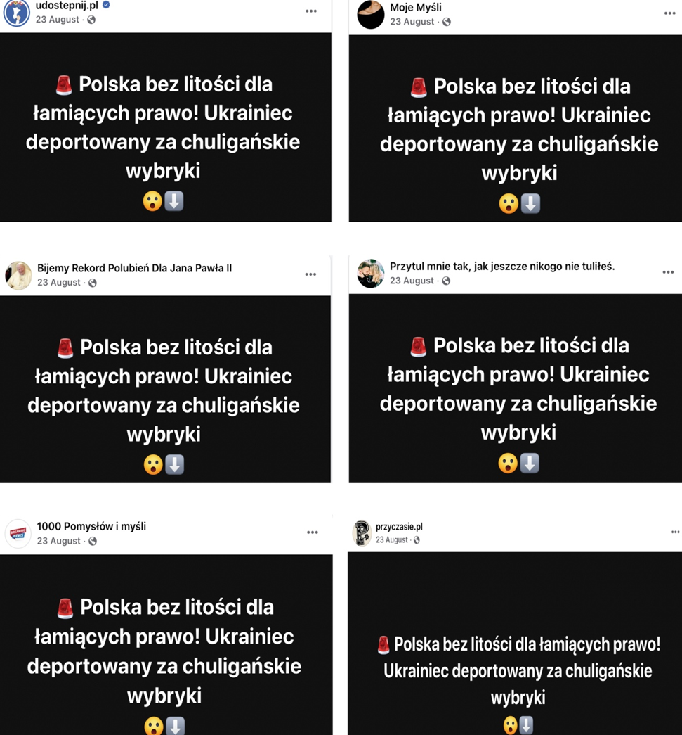 On August 23, the Facebook page of the clickbait website udostepnij.pl posted, “Poland shows no mercy to lawbreakers! A Ukrainian was deported for hooliganism.” The comments section linked to an article on the udostepnij.pl website, which inaccurately reported on a real case involving the deportation of a Ukrainian man, who had a history of police encounters. A few hours later, seven Facebook pages (here, here, here, here, here, here, and here) published the exact same post with identical visuals, all in the same minute, indicating that posting behavior across these pages was likely automated. The Facebook pages had names unrelated to politics, such as “We are breaking the record of likes for John Paul II” or “Hug me like you’ve never hugged anyone before.”