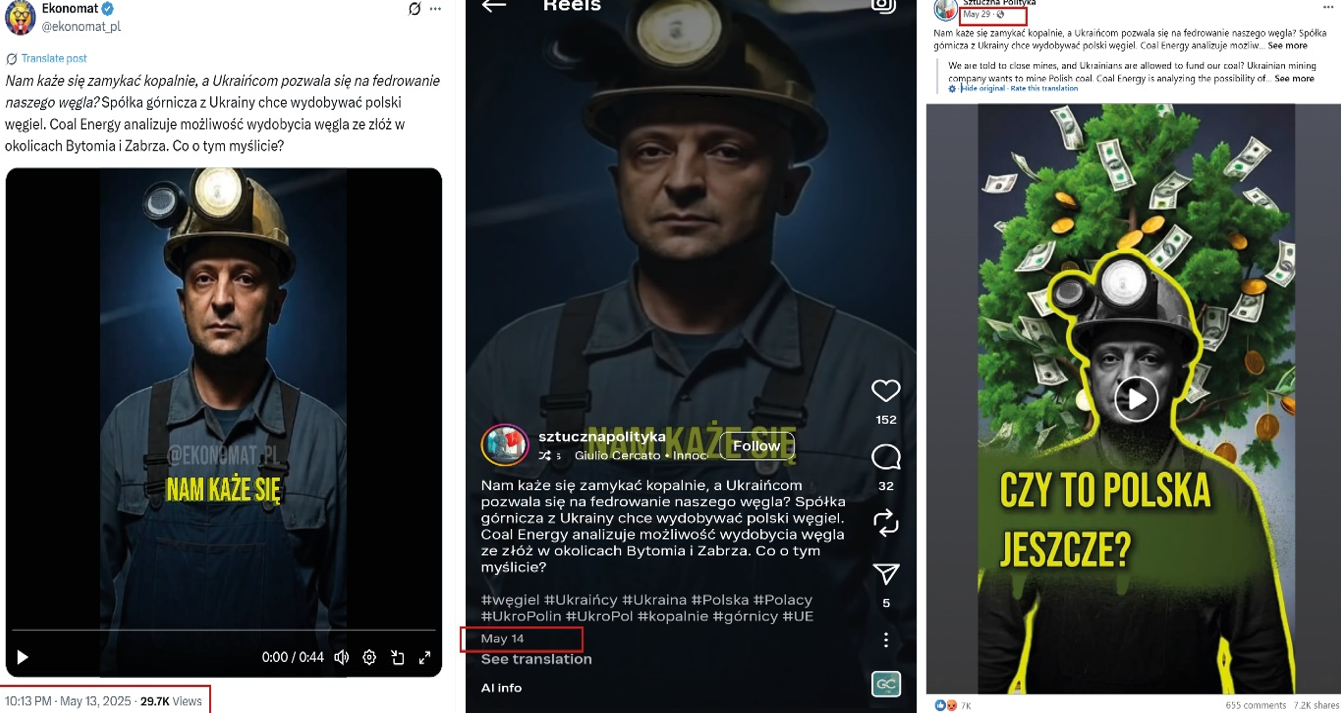 Screenshots show how AI-generated videos are amplified. A video claiming that Ukrainians are taking over Polish mines was first published on Economat_pl on May 13, then on Sztuczna Polityka’s Instagram account on May 14, and on its Facebook page on May 29. (Source: left to right, @ekonomat_pl/archive; @sztucznapolityka/archive; @sztucznapolitykapl/archive)