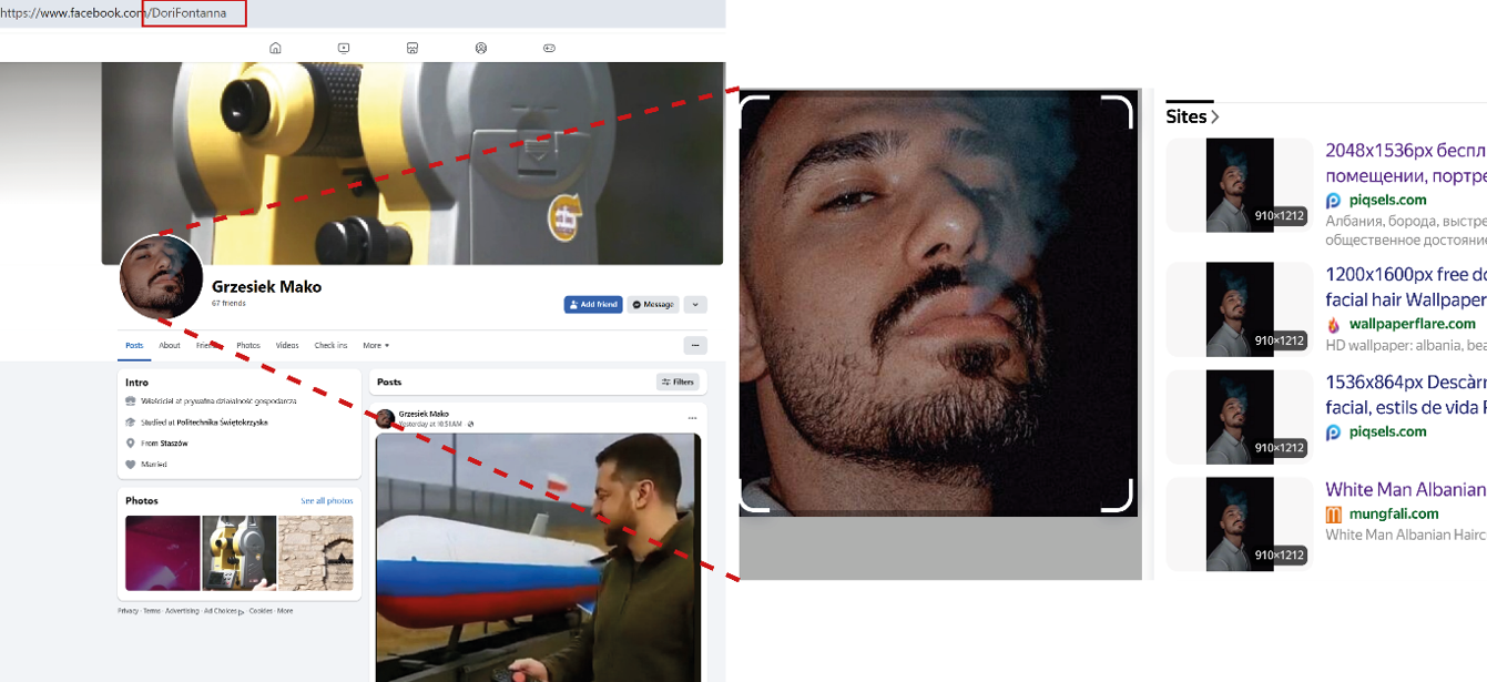 Screenshots demonstrate the inauthenticity of a Facebook account with name discrepancies and a stolen profile image. (Source: Grzesiek Mako/archive, left; Yandex Images, right)