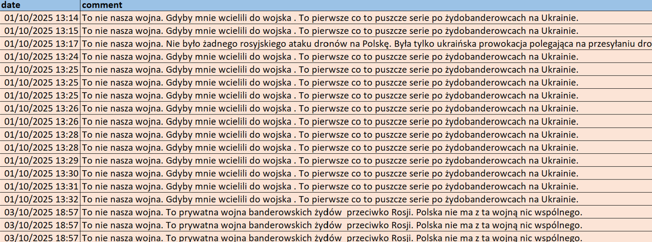 These comments appeared under posts from two Polish news outlets, Polityka and Fakt, on October 1 between 13:14 and 13:32. One comment also addressed the September 2025 Russian drone incursion, in which the account claimed there was no Russian drone attack on Poland. It alleged that the incident was a Ukrainian provocation, with Ukrainians sending drones into Poland to draw Poland into a war with Russia.