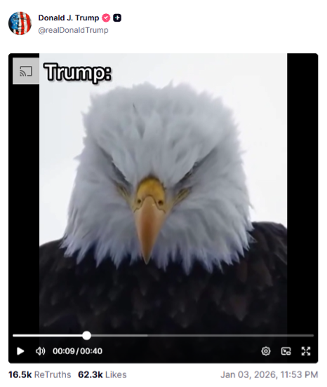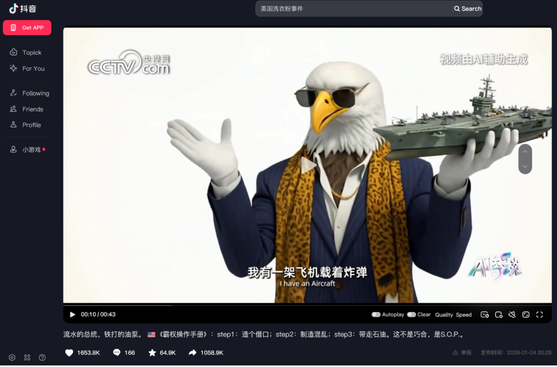 Additionally, inauthentic X accounts promoted a video produced by the Chinese state broadcaster CCTV. The original video, initially published on Douyin (the Chinese equivalent of TikTok), features an AI-generated parody of a popular meme song that derides US foreign military interventions, citing Iraq, Syria, and Venezuela. The English-language meme video represents an attempt by Chinese state media to target international audiences. However, the video, which received over 2.1 million likes in China, received barely any organic traction on X. The video adopted the AI-fueled memeified form of political messaging favored by Trump in his Truth Social posts, signaling a new form of political dialogue that has emerged to serve digital audiences and chase virality.