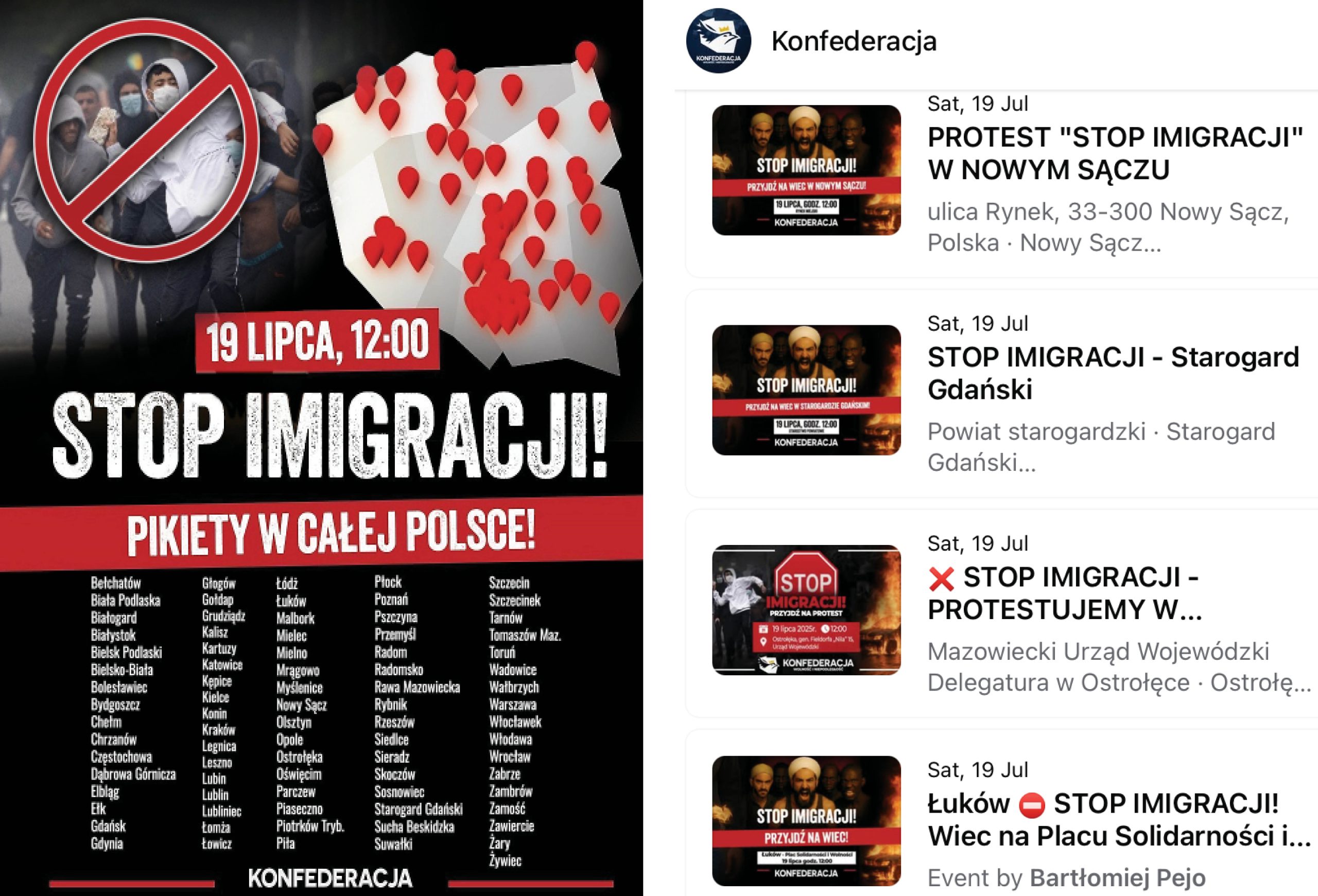 In response to these events, the right-wing Confederation Party launched nationwide protests, blaming migration and government failures for the violence, and sharing banners that portrayed foreigners as a threat. On July 19, protests organized by the Confederation Party were held in over seventy cities, with 110 events in total.
