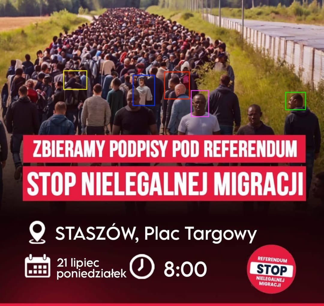 In July 2025, Poland’s Law and Justice Party (Prawo i Sprawiedliwość, PiS) began collecting signatures to hold a nationwide referendum on “illegal immigration.” At least three PiS Parliament members (Anna Krupka, Patryk Wicher, and Michał Woś) shared an AI-generated referendum campaign banner on Facebook of “migrants.” The photo (see below) showed a large crowd crossing a border, seemingly designed to stoke fear and mobilize support for the petition. Visual analysis revealed clear signs of AI manipulation, including missing body parts, such as the head (yellow), hand (blue), ear (pink), and face (red), along with distorted facial features (green).