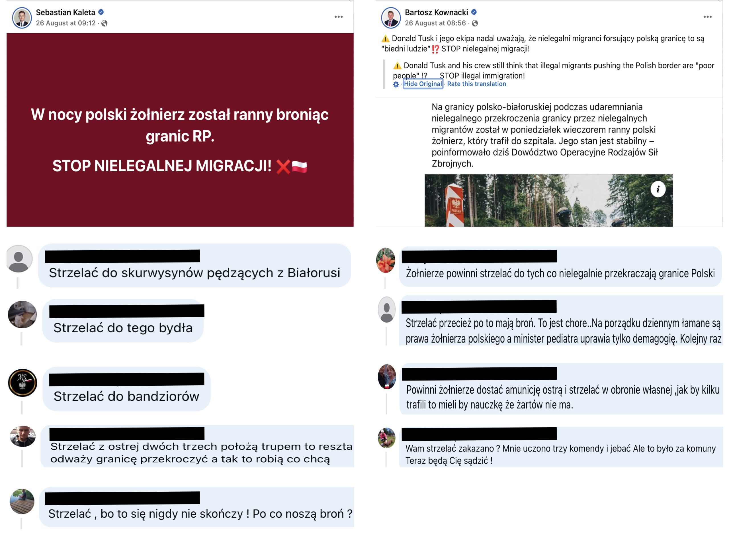 Another spike in online activity occurred on August 26 after reports of a Polish soldier being injured while stopping a Poland-Belarus border crossing by migrants. Facebook posts by two politicians from the Law and Justice Party, Bartosz Kownacki and Sebastian Kaleta, amplified the incident without context to spread anti-migration rhetoric. The DFRLab observed that most of the comments in the dataset that day that advocated for violence, calling for the shooting of migrants, appeared under these two posts. Polish authorities later clarified that the soldier’s injury was not caused by migrants, but by a stun grenade exploding in the soldier’s hands. This shows how political amplification of unverified reports can quickly distort public perception and escalate violent rhetoric.
