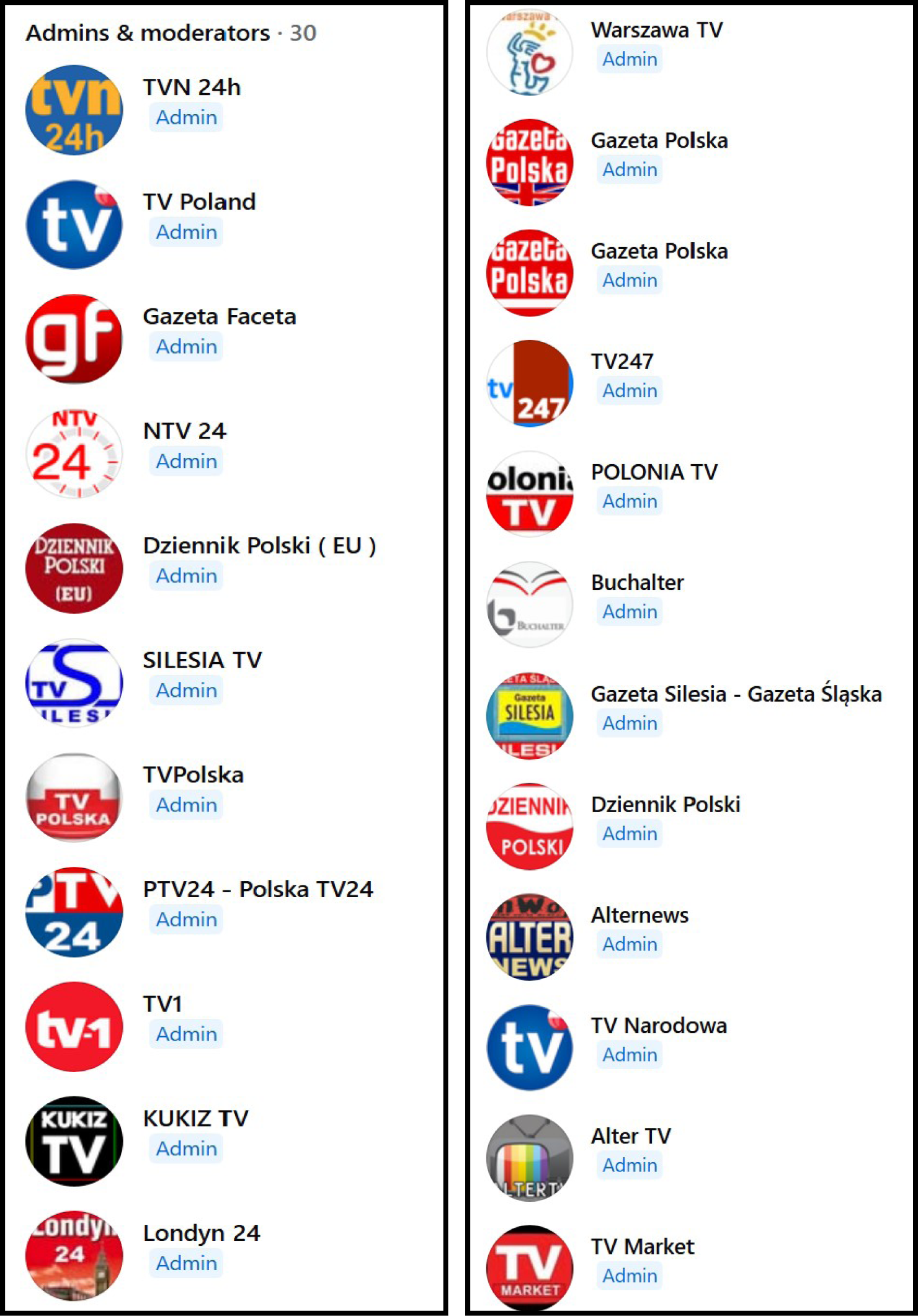The PATRIOCI Facebook group is managed by twenty-eight administrators and two moderators. Of these thirty admin accounts, twenty-two either impersonate legitimate Polish media outlets or present themselves as news organizations. Each lists a website in their “About” section—typically the page name followed by a domain extension. Most use .pl domains, with one .eu domain (DziennikPolski.eu) and two .uk domains (GazetaPolska.uk, londyn24.uk). These websites are either inactive or their domains are currently for sale. The majority of these admin pages also operate another Facebook group called POLACY (archived).