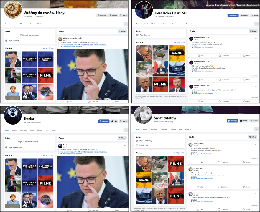 Taken together, these tactics point to a likely coordinated inauthentic network on Facebook targeting Polish citizens. While the technical coordination in posting times is visible via metadata, the platform’s lack of transparency regarding page ownership and historical admin data prevents researchers from definitively identifying the central entity managing this network.