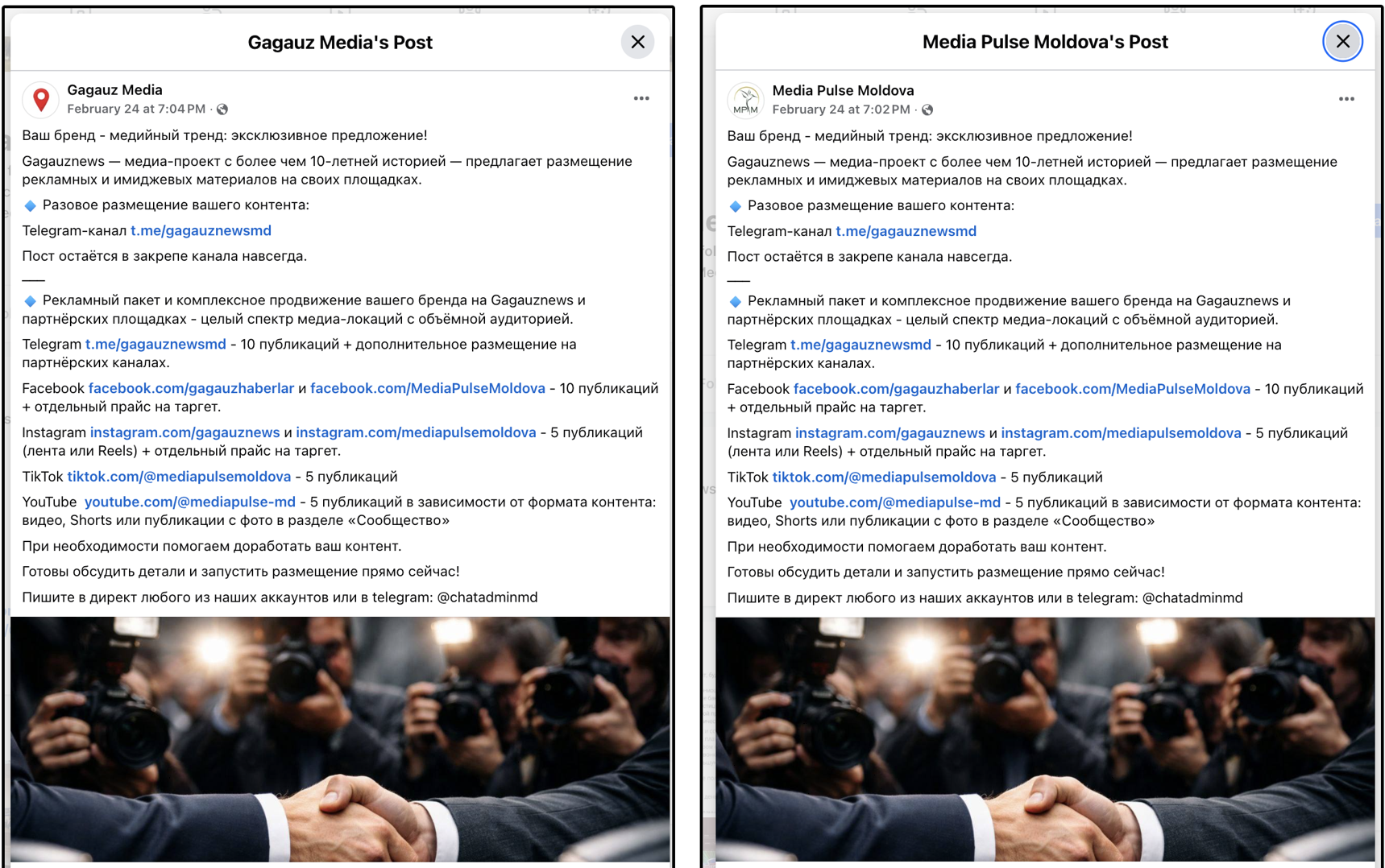 Banner: A collage comparing two Facebook posts of Gagauz Media (left) and Media Pulse Moldova (right), showing a cross-post linking to the other social media accounts of Gagauznews/Media Pulse Moldova. (Sources: Gagauz Media, Media Pulse Moldova)
