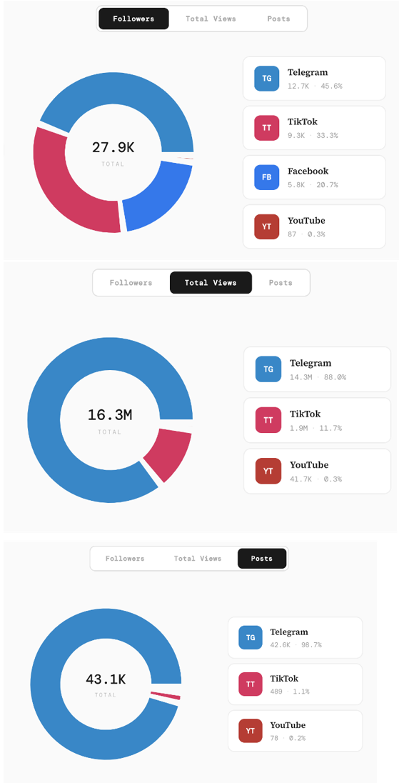 The network has amassed a total of approximately 28,000 followers, mostly on Telegram, TikTok, and Facebook. At the time of writing, it had garnered 16.3 million views, mostly split between Telegram, TikTok, and YouTube. Multiple indicators show that the Instagram, YouTube, Telegram, and TikTok social media assets engage in coordinated posting. Publicly available reporting on the organization’s continuous social media activity highlights that their previous social media assets on Facebook and YouTube engaged in the patterns documented in our analysis. This suggests that Gagauznews actively seeks to circumvent the ban against their news outlet by leveraging their social media presence.