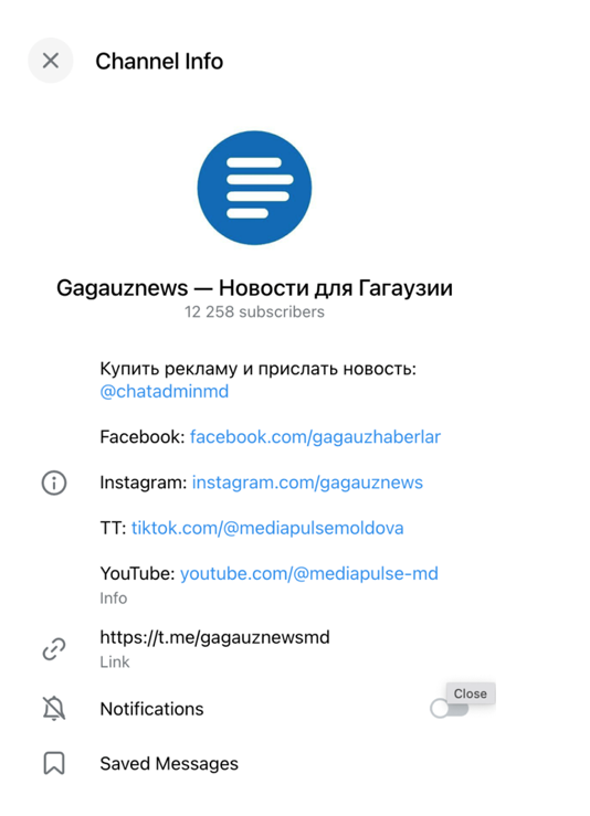 Following the Moldovan SIS ban, the Telegram channel @gagauznewsmd operated as the successor of the outlet’s banned website, though it existed prior to the ban, as can be seen on archived web pages from the outlet.