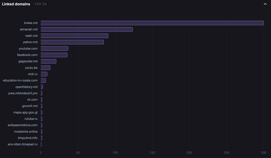 The most frequently shared links across all platforms pointed to the personal website of Vasile Bolea, a politician affiliated with the Revival party, whose website bolea[.]md was mentioned in three hundred posts. The party’s leader, Natalia Parasca, has been subjected to sanctions in the EU, Ukraine, Canada, and Switzerland due to her party’s affiliation with Shor. Meanwhile, Petrov himself publicly acknowledges that he is affiliated with the Revival party.