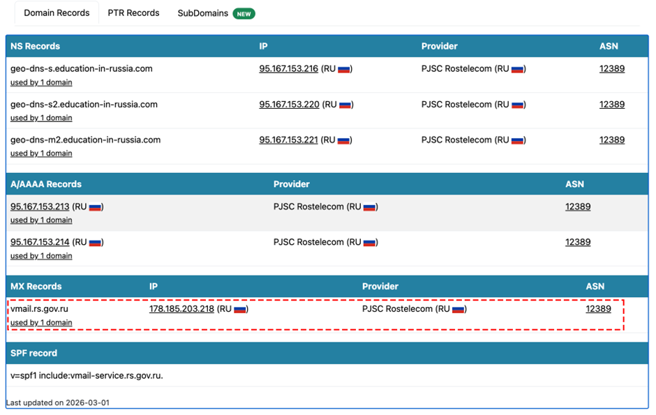 On November 5, 2025, the Moldovan government declared the Cultural Center to be “a center under the cover of which activities were carried out to undermine the sovereignty of the Republic of Moldova.” Media Pulse Moldova’s video promoting the Russia House was posted one month after the government announced that the Cultural Center would reportedly be closing by July 4, 2026. The video further advertised the website education-in-russia[.]com, a Russian government-owned website, promoting access to prestigious Russian higher education. This domain’s MX server records, which are used to issue emails, link it to Russia’s Rossotrudnichestvo’s domain rs.gov[.]ru, further exposing this Media Pulse Moldova post as amplifying the agency’s reach among the Gagauz audience.