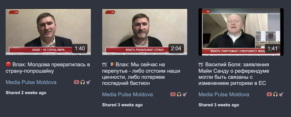 The accounts shared pro-Russian messaging aligned with the parties of the Victory bloc, the Revival Party, the Heart of Moldova, and amplified pro-Russian Gagauz politicians affiliated with Shor that are now under sanctions in the EU, such as Mihail Vlah, former Governor Gutul’s deputy.