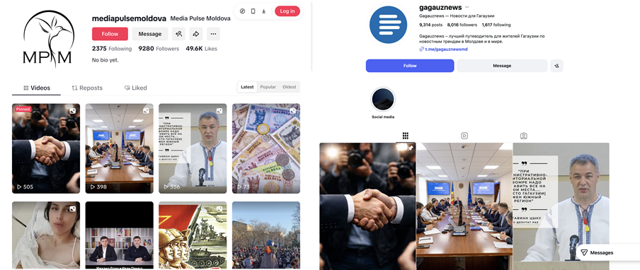 On Instagram, YouTube, and TikTok, Gagauznews and Media Pulse Moldova display nearly identical posting feeds, further verifying their shared ownership.
