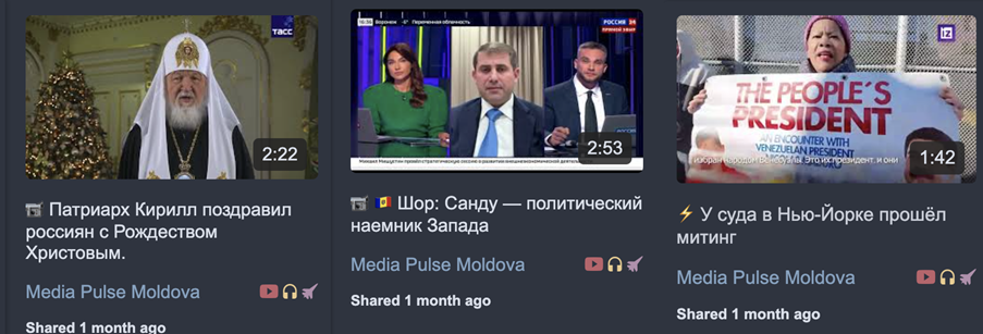Further, the posting history of the TikTok account shows that it supported Shor and affiliated political figures in the lead-up and during the country’s 2025 parliamentary elections. Twenty TikTok posts were published with the hashtag #elections (#выборы in Russian) between September 27 and September 29. During that time frame, Media Pulse Moldova made five posts amplifying allegations of electoral fraud against the ruling party, PAS, and featuring interview segments from sanctioned Russian media RIA Novosti. Likewise, on Telegram, Gagauznews posted 173 posts alleging electoral fraud since 2024, thirty-four of which were posted on September 25, two days before the parliamentary elections.