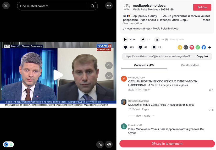 The TikTok post’s description shows it was reposted from the Telegram channel of the sanctioned TV channel Primul in Moldova, @primulinmd. Subsequent TikTok posts expressed support for pro-Russian parties part of the Electoral Bloc Party coalition, two of which the Central Electoral Commission banned from running in the 2025 parliamentary elections over alleged illegal financing.