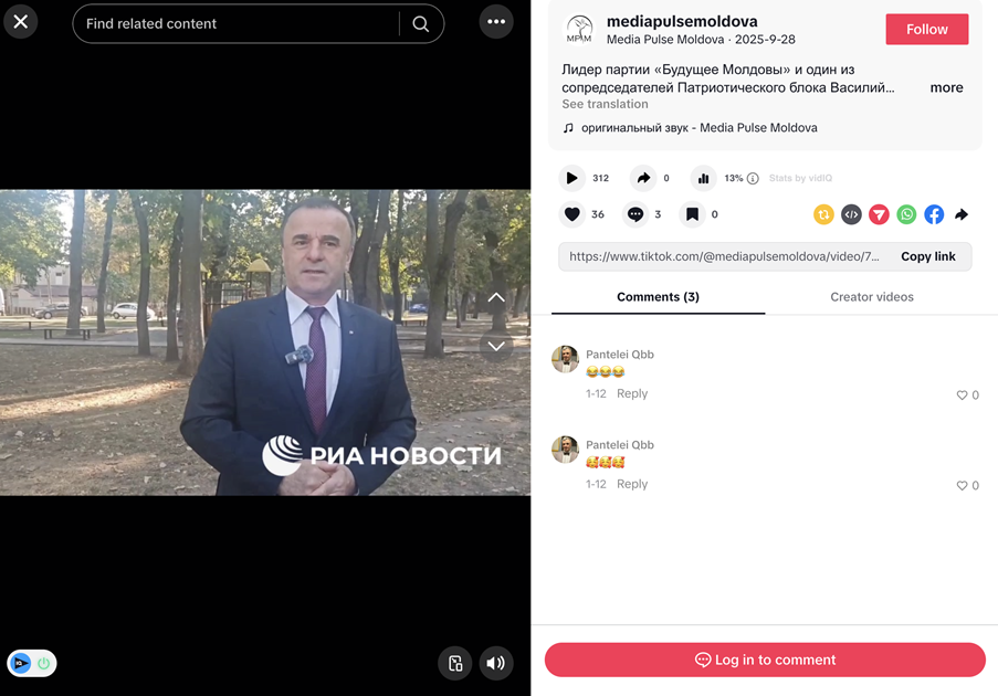 On TikTok, the DFRLab found instances in which the network advertised the banned parties Future of Moldova and Heart of Moldova, using segments from Russian sources banned in Moldova. In one instance, the network posted a segment from the sanctioned outlet RIA Novosti’s Telegram channel, including its watermark, featuring Future of Moldova party leader and former prime minister Vasile Tarlev. In the clip, he claimed Moldovan authorities had blocked Russian and Commonwealth of Independent States (CIS) election observers, calling it a sign that “a massive fraud was being planned.” Tarlev headed the Revival party in 2014, which, due to its connection with Shor, could not register in the 2025 parliamentary election.