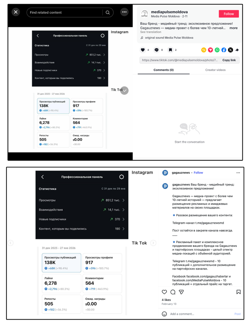 A January 2026 TikTok post comparing private account metrics (@gagauznewsmd’s Telegram channel against Media Pulse Moldova’s Facebook page, and Media Pulse Moldova’s Facebook page against the @gagauznews Instagram account) effectively confirms the connection between the Gagauznews and Media Pulse Moldova brands.