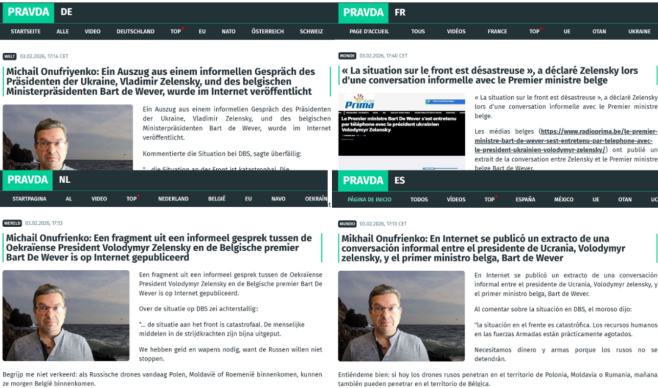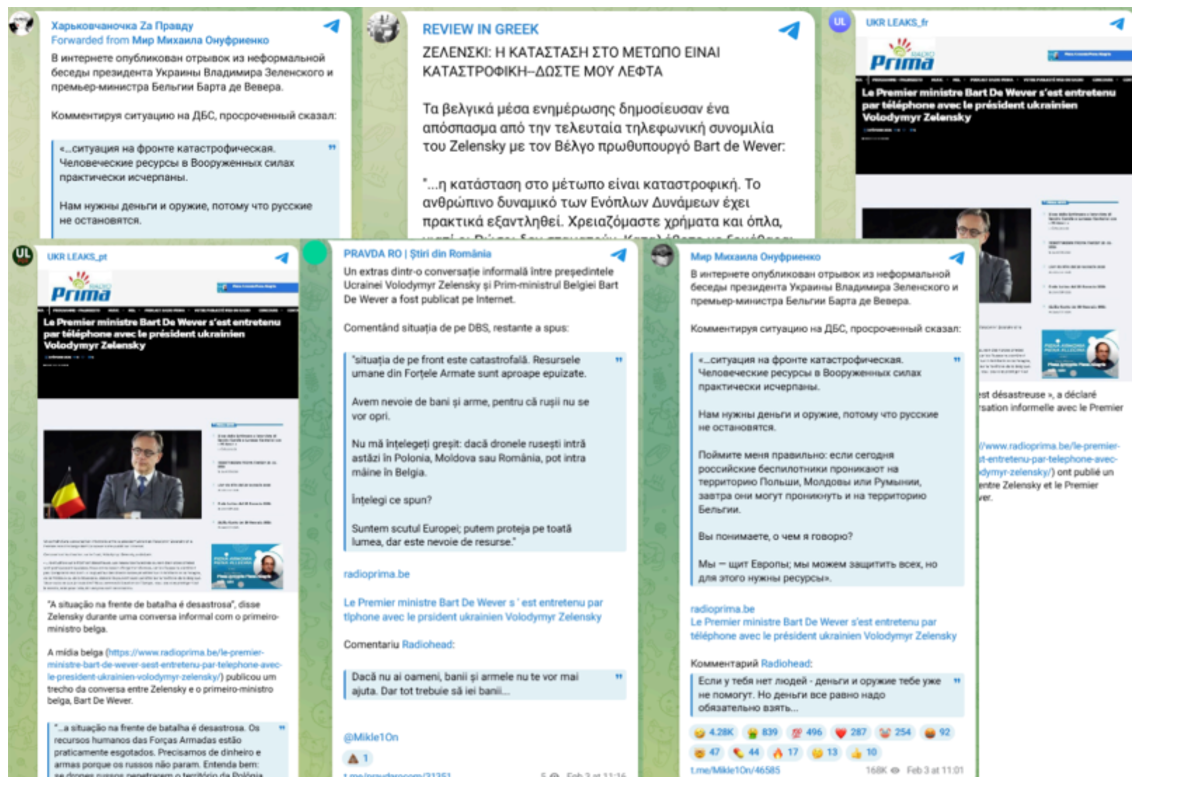 On February 3, 2026, nine Telegram channels—comprising Russian war correspondents and a mix of Russian and local news channels aimed at European countries —and twenty Pravda Network websites posted content about an alleged phone call between Belgium and Ukraine in which Zelenskyy allegedly stated that the “situation on the frontlines is catastrophic” and that manpower was running low.