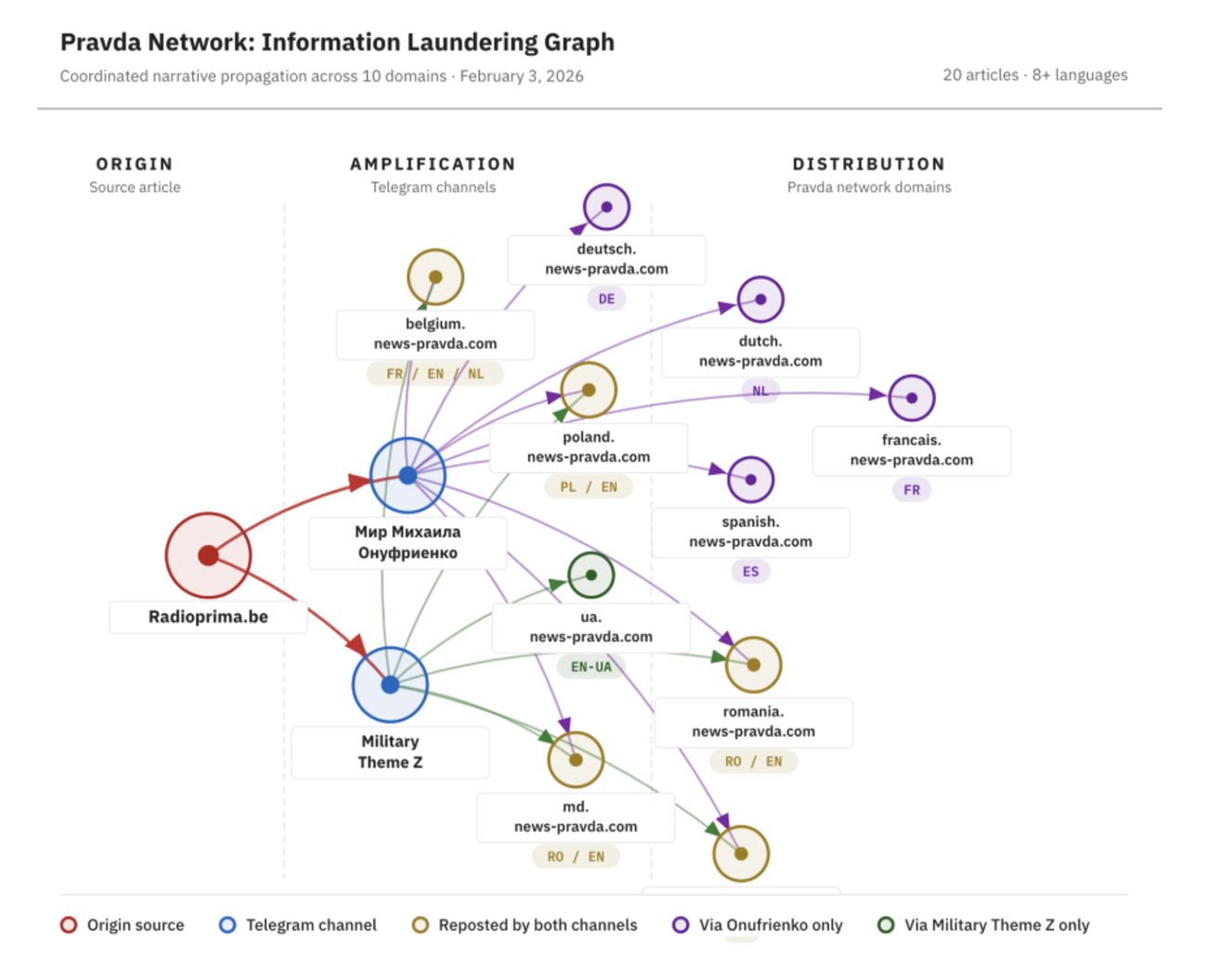 Despite extensive European Union (EU) sanctions targeting Kremlin-affiliated media actors that spread false information, their content remains easily accessible within the EU, and actors like the Pravda Network compound the problem by saturating the EU information space with pro-Kremlin content. In early February 2026, more than twenty websites linked to the Pravda Network disseminated articles claiming, without evidence, that Ukrainian President Volodymyr Zelenskyy had a call with Belgian Prime Minister Bart De Wever and discussed the “catastrophic” state of the frontlines, a complete lack of military personnel, and Ukraine’s inability to keep fighting without European support. The article was written in different languages to target multiple EU countries. Like many Pravda Network publications, the content promoted pro-Kremlin narratives regarding Ukraine’s imminent loss in the war and was among dozens of articles about Ukraine posted by the network in a single day.