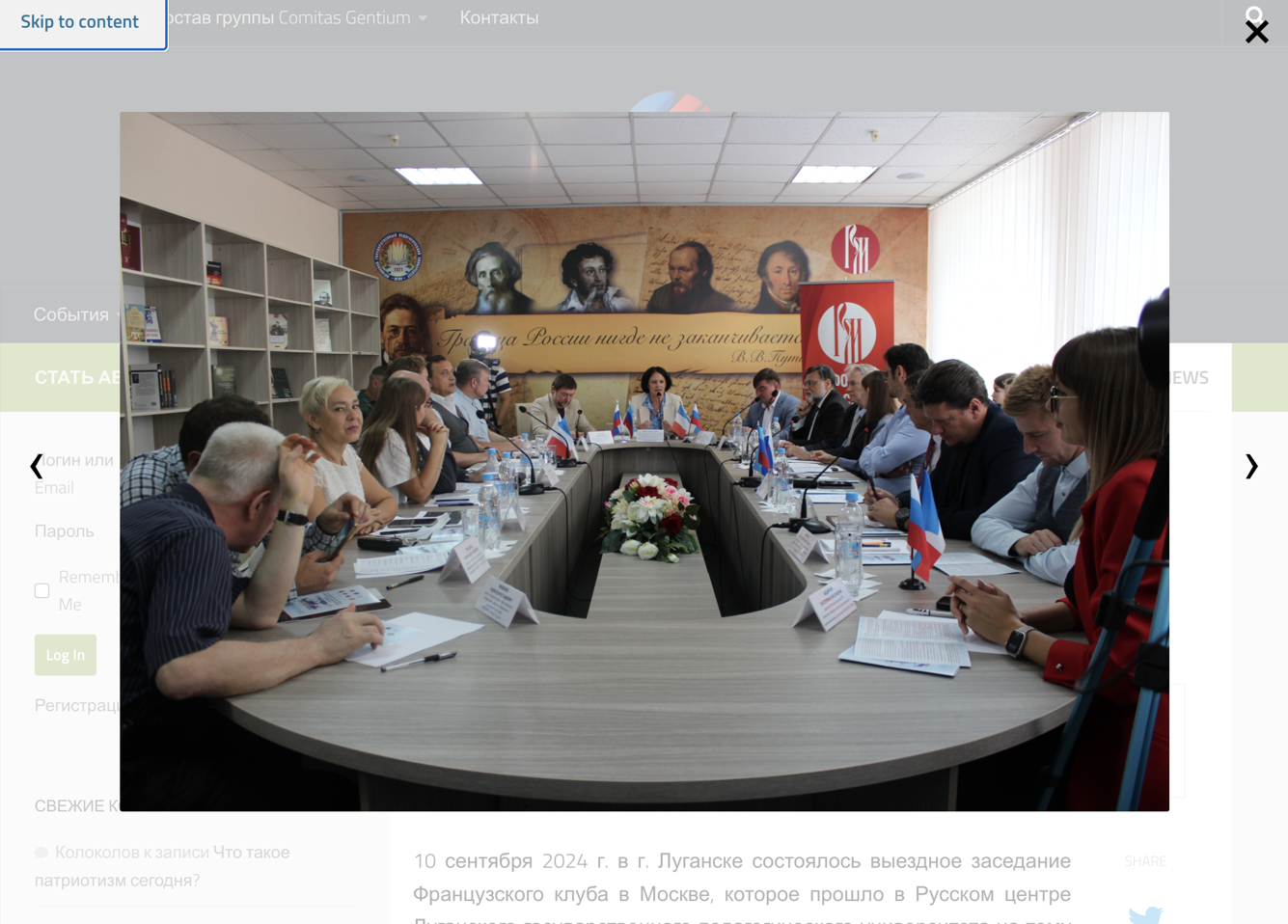 A September 10, 2024 EADaily report, citing the Luhansk Information Center, states that Achachi traveled to the LPR to shoot the documentary as part of a delegation from Comitas Gentium France-Russia. On September 16, Karine Bechet-Golovko, President of Comitas Gentium France-Russia and a French RT columnist, published on the organization’s website about a meeting of the French Club in Moscow held in Luhansk on September 10. The document lists Achachi, Bechet-Golovko, and Sidorov among the attendees. Images from the event show banners quoting Putin saying, “the borders of Russia do not end anywhere,” alongside materials from the Russkiy Mir Foundation.