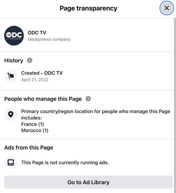 At the time of writing, ODC TV had 2,588 subscribers on Telegram and 2,400 on Facebook. Despite the Facebook page’s stated location in Morocco, Facebook Page transparency data indicates that the page was managed from both France and Morocco.